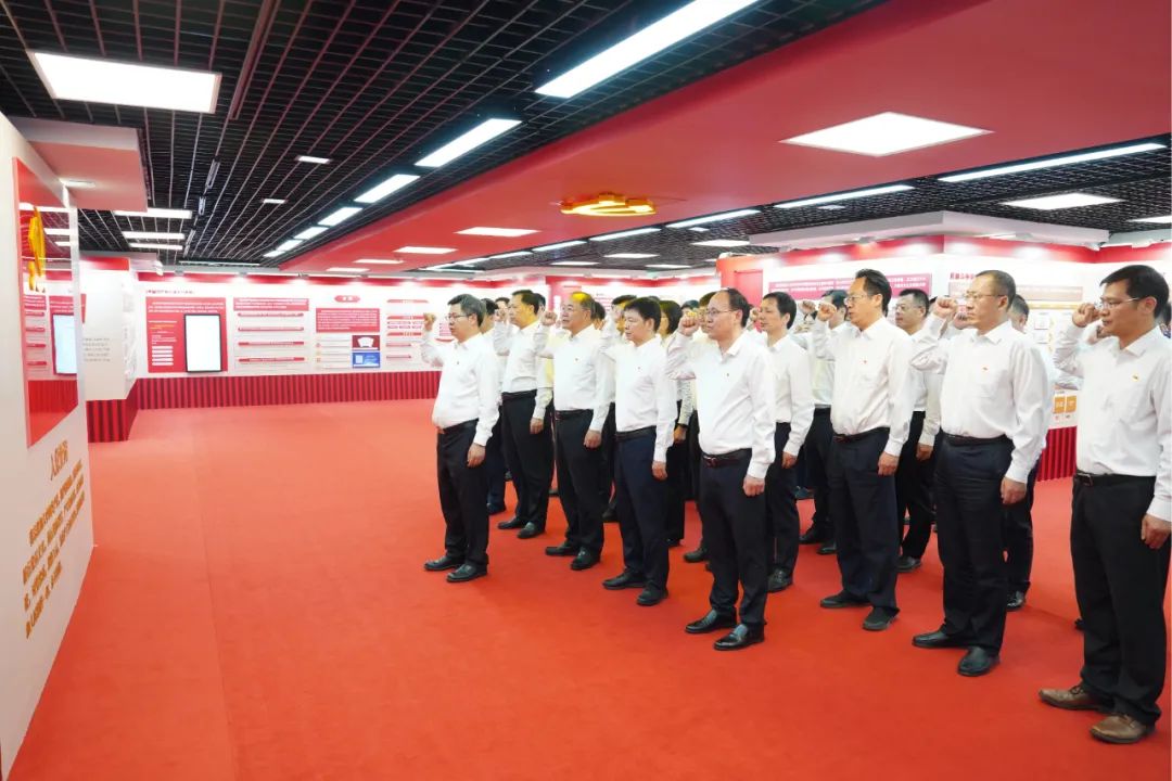 參觀后,陳錫明帶領大家面向黨旗重溫了入黨誓詞。(文攝/韓超)